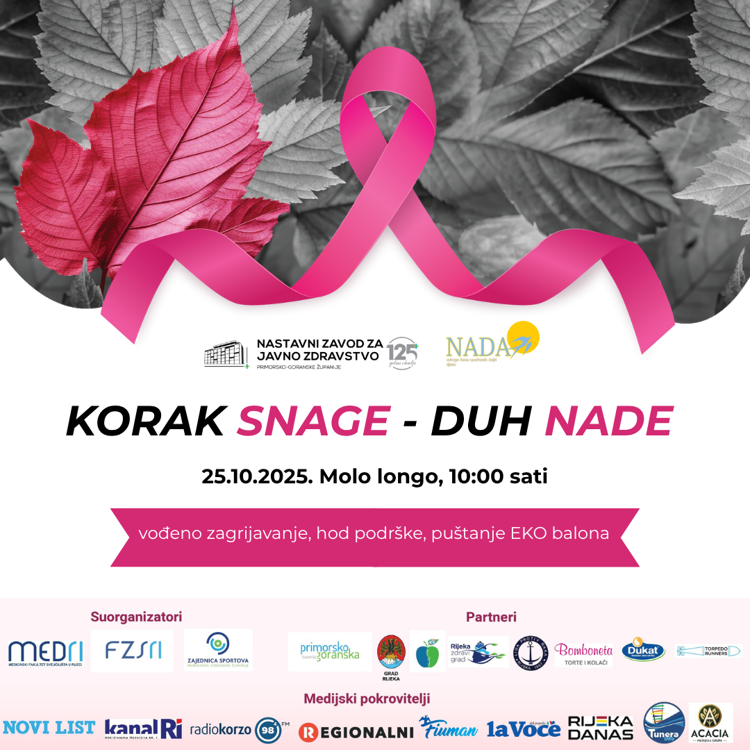 Javnozdravstvenom akcijom „Korak snage – duh Nade“ završava obilježavanje „Ružičastog listopada“- mjeseca svjesnosti i borbe protiv raka dojke. U subotu, (25. listopada 2025.godine) u 10:00 sati na Riječkom lukobranu pozvani su svi da hodanjem i trčanjem daju podršku oboljelima od raka dojke. Svi sudionici i posjetitelji pozivaju se da odjenu ružičasto kao znak podrške.