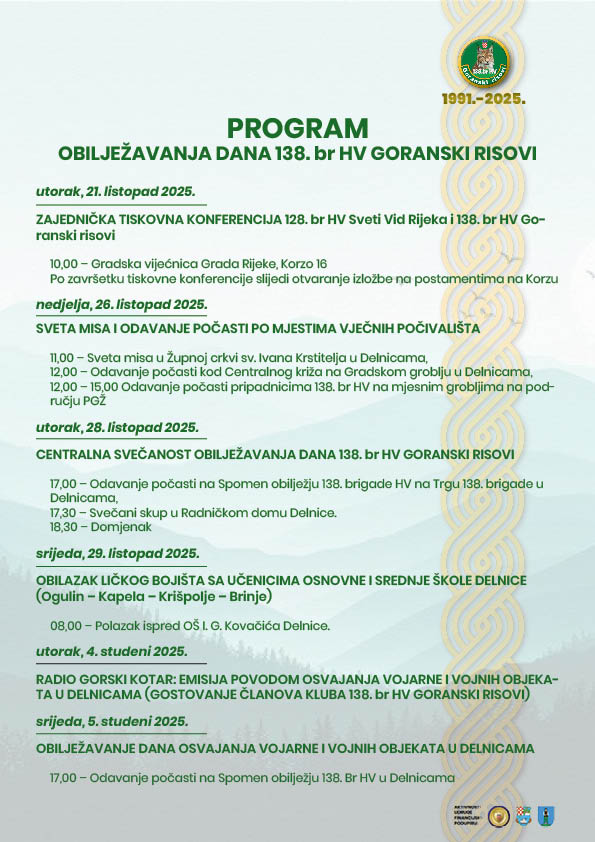 Dan 138. brigade HV „Goranski risovi“ bit će svečano obilježen u Delnicama u utorak 28. listopada, odavanjem počasti na Spomen-obilježju 138. brigade u 17 sati, nakon čega će u Radničkom domu Delnice u 17.30 sati započeti svečani skup.