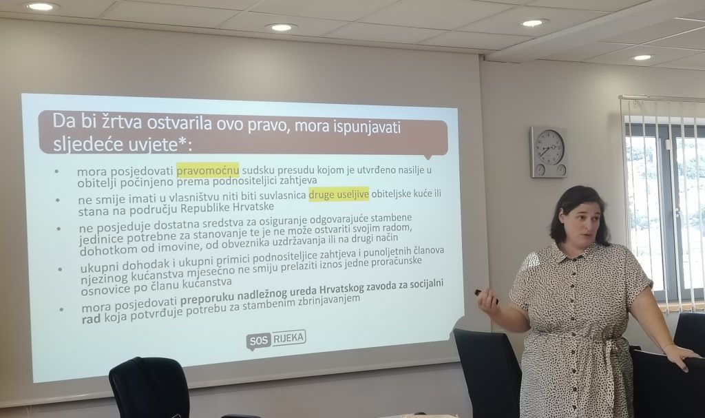 Predavanje je obuhvatilo uvjete za ostvarivanje prava na stambeno zbrinjavanje, postupak podnošenja i odobravanja zahtjeva te praktične aspekte provedbe mjere, uz naglasak na važnost pravodobnih informacija i kontinuirane podrške ženama u ostvarivanju njihovih prava.