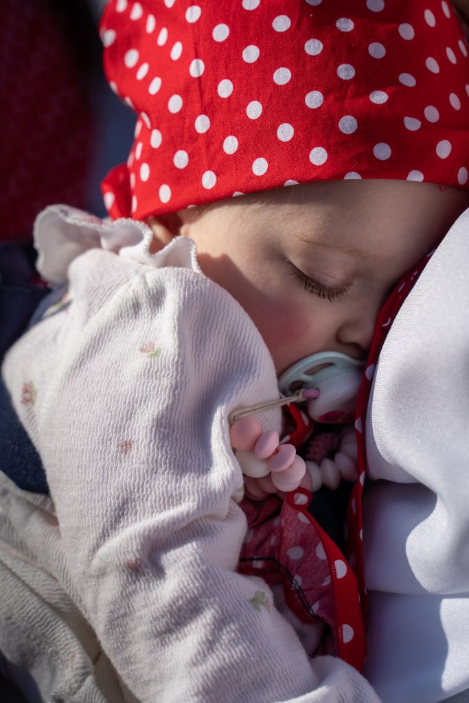 Fotografija „Utjeha“ autora Gorana Grudića donosi potpuno drugačiji ton. U krupnom planu vidimo bebu koja mirno spava u bijeloj robi s crvenom maramom na bijele točkice. Dok karneval obično povezujemo s bukom i pokretom, ovdje vlada tišina i nježnost. Kontrast između živopisne marame i spokojnog izraza lica stvara dirljiv i intiman trenutak usred svečanosti.