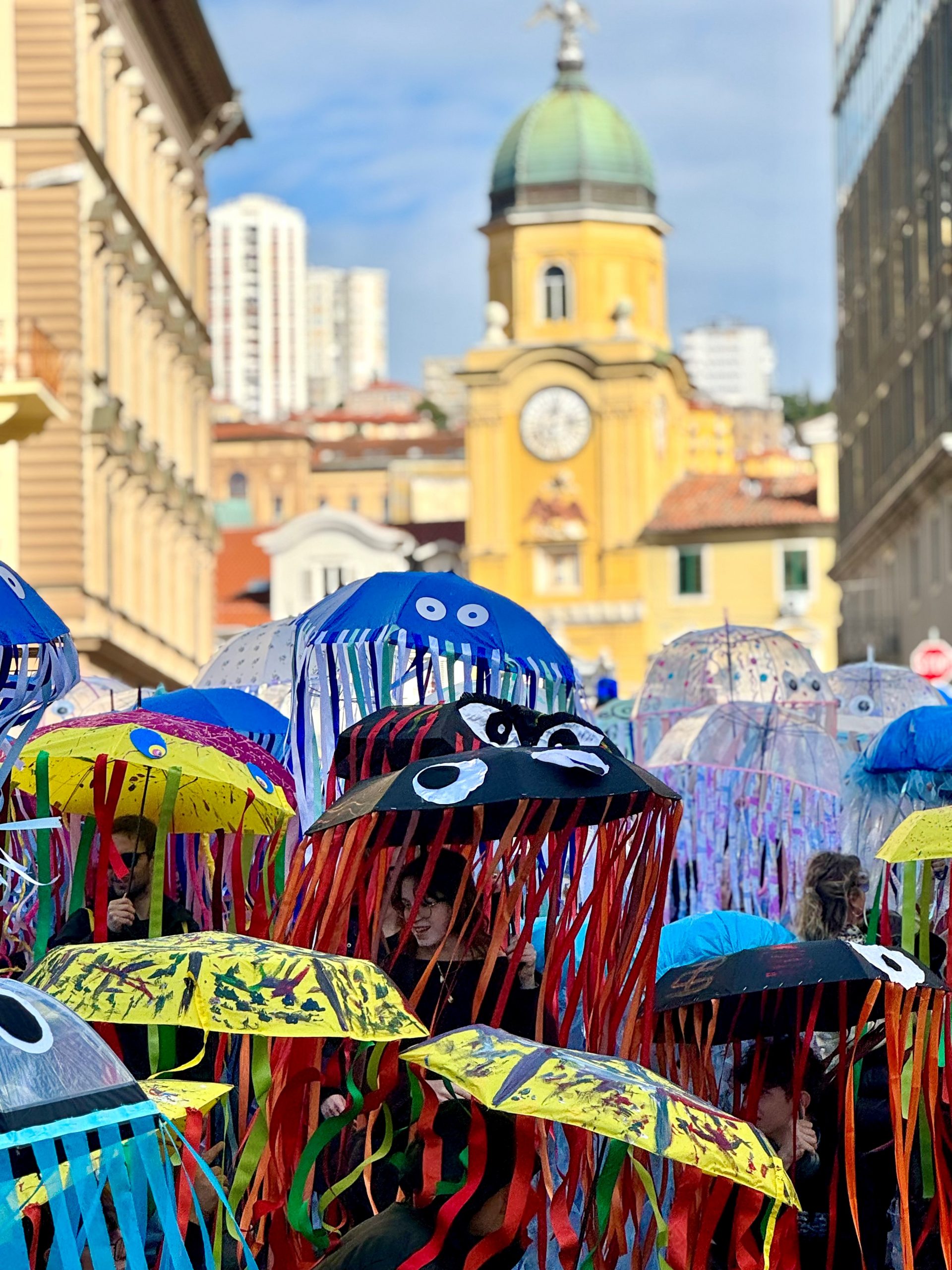 Četvrta fotografija, „Šarene meduze u gradu“ autorice Nataše Vučinić, prikazuje povorku ljudi pod šarenim kišobranima pretvorenima u meduze. Duge, raznobojne trake vise poput pipaka, dok je gradska ura u pozadini blago zamućena, čime se ističe prvi plan i dodatno naglašava njegov značaj. Ova scena odiše kreativnošću i kolektivnom radošću karnevala, kao svojevrsna umjetnička intervencija u svakodnevni gradski život.