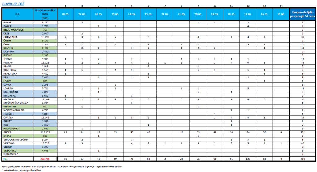 Iz Rijeke te općina i gradova riječkog prstena je 30 novooboljelih, tri iz Crikveničko-vinodolskog područja te po jedna osoba s područja Liburnije i otoka Krka.